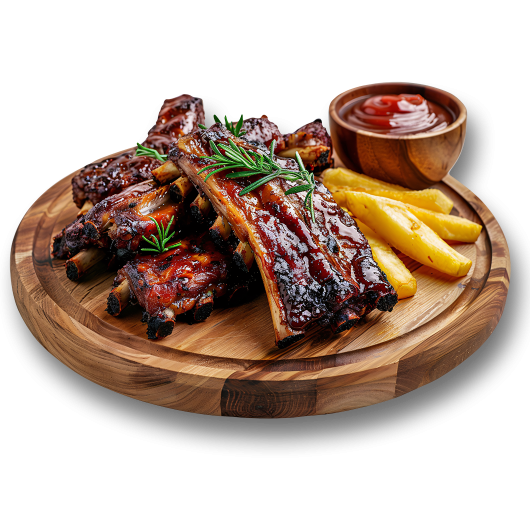 24,50 €Barbecue Schweinerippchen, super zart und etwas pikant, dazu Pommes frites und Barbecue Dipp -